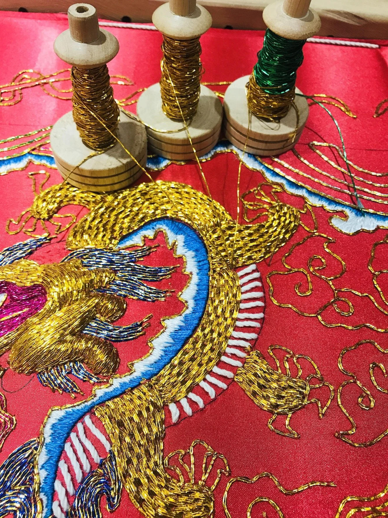 The project takes form through three embroidered works, each incorporating these mythological elements as a way of cultivating a more intimate connection with this inner divinity. Rooted in traditional Taiwanese and Chinese embroidery techniques that I have previously studied, the works are reimagined through subtle interventions and personal adaptations. These gestures allow the pieces to hold layered meanings—bridging inherited cultural language with individual experience.
