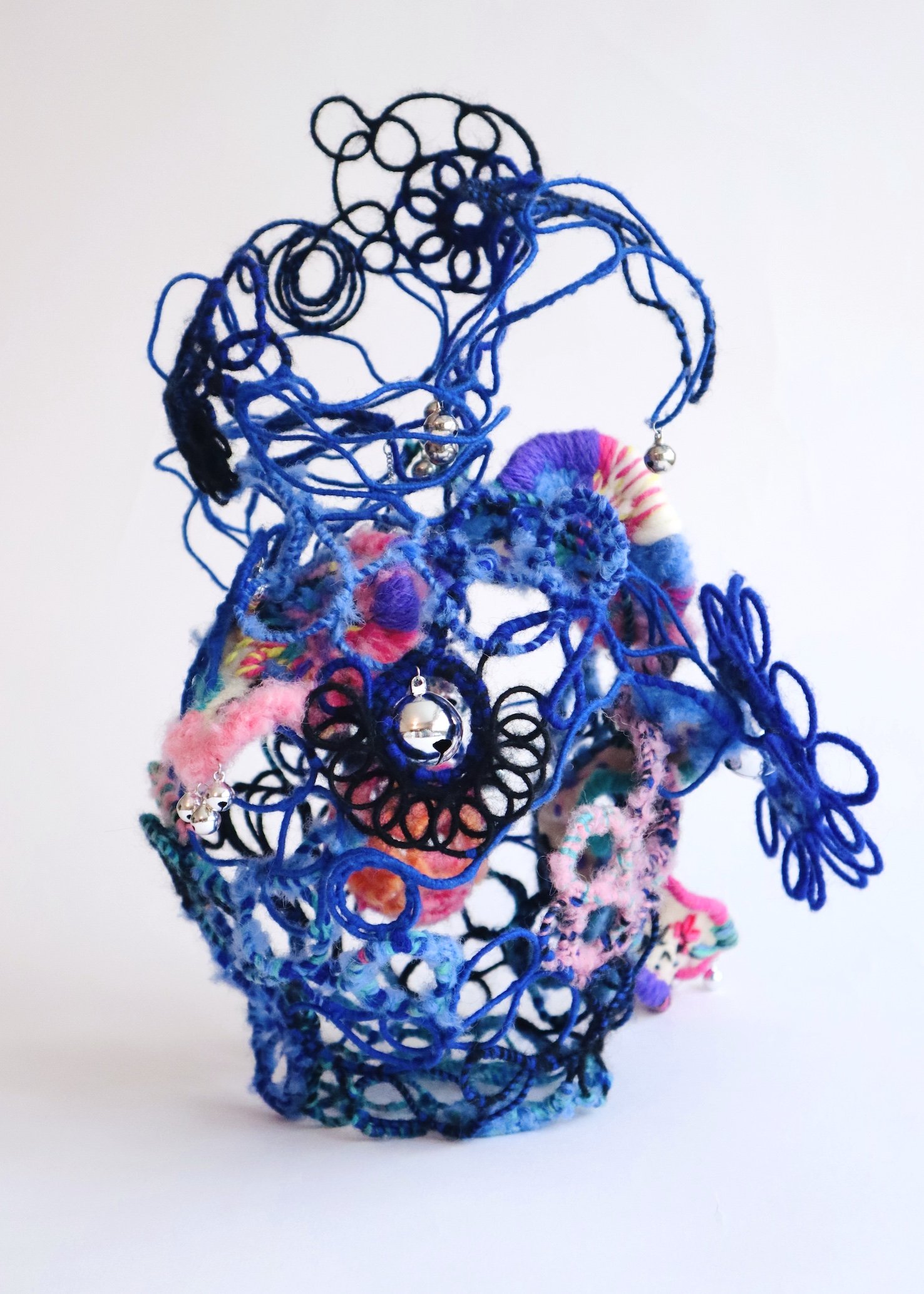 Where to, Miss? is a two-piece series of coiled and embroidered soft sculptures and percussion instruments that explore female objectification and the longing for liberation.